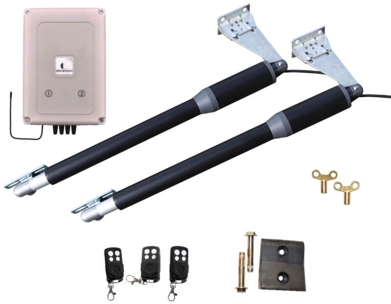 Obsah balení: 2ks pohonných motorů 24V, plně programovatelná řídící jednotka s transformátorem, tři dálkové čtyř kanálové ovladače s dosahem 50m z automobilu s plovoucím kódem, kompletní kovové pozink. příslušenství pro montáž (profily síly 6mm), gumový středový doraz pro zavření křídel brány, 2ks odepínací klíče pro případ výpadku el. energie, podrobný návod na montáž, zapojení a nastavení v češtině.